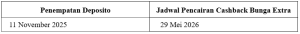 3. Cashback Bunga Extra hanya berlaku untuk dana segar maksimal senilai Rp5,000,000,000,- yang bersifat akumulatif dari total pembuatan rekening deposito yang dilakukan pada 11 November 2025.