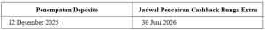 3. Cashback Bunga Extra hanya berlaku untuk dana segar maksimal senilai Rp5,000,000,000,- yang bersifat akumulatif dari total pembuatan rekening deposito yang dilakukan pada 12 Desember 2025.